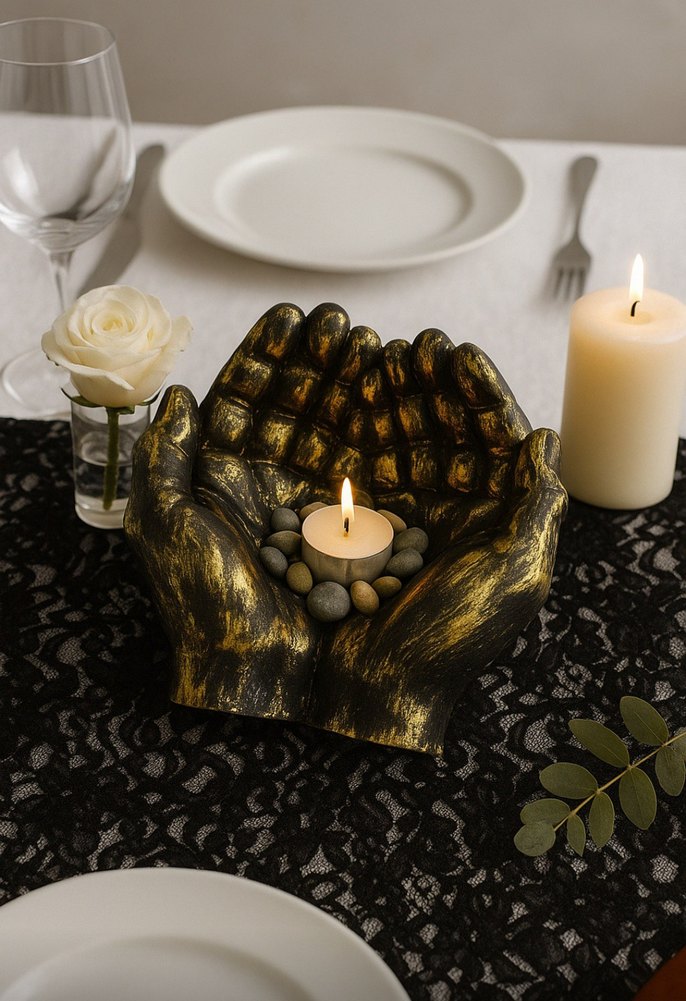 Küçük mum ve taşlarla çevrili, el şeklinde koyu altın renkli mumluk, sıcak bir atmosfer sunar. ️