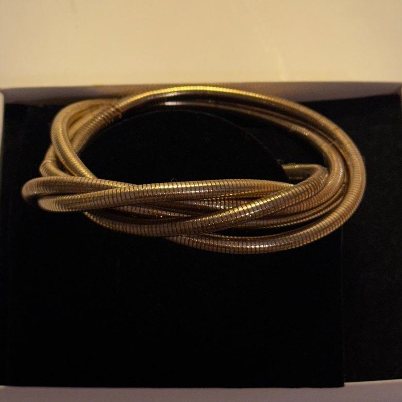 Parlak altın renkli, elastik yapıda yılan desenli bilezik. Vintage tarzıyla çağdaş bir görünüm sunar, günlük kullanım için uygundur. Kullanilmadi. Fotografta tuy gibi seyleri cekmis sekilde duruyor ama temizdir şüpheniz olmasin. Koyu renk altin