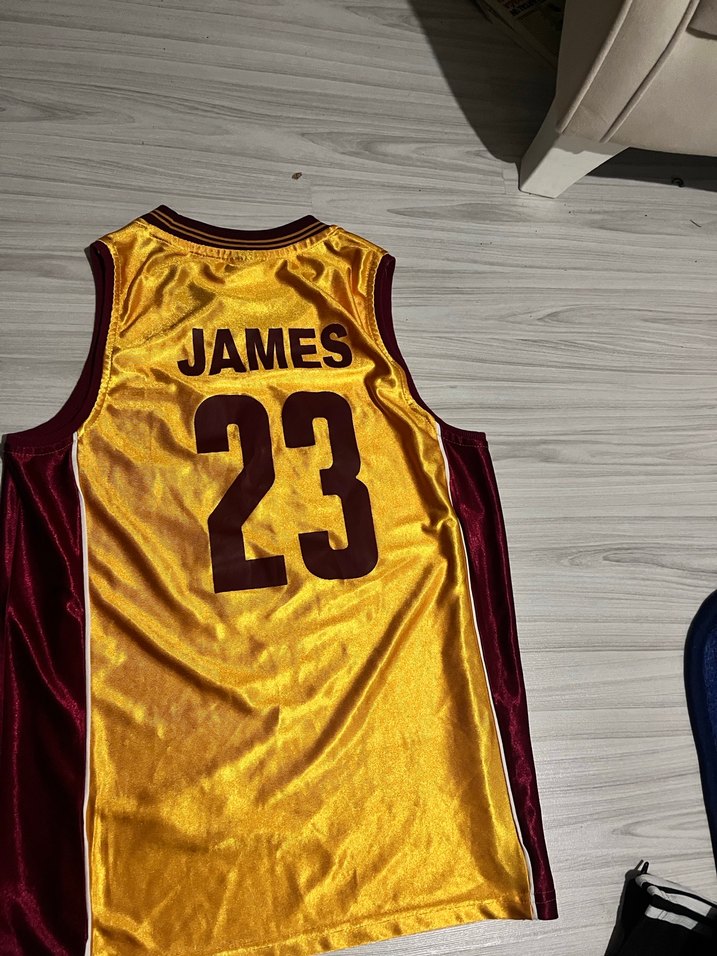 Altın parlak sentetik kumaştan, kolsuz, yuvarlak yakalı ve bol kesim erkek forması. Sırtında "JAMES" ve "23" baskılı, spor ve sokak stili için uygun.
