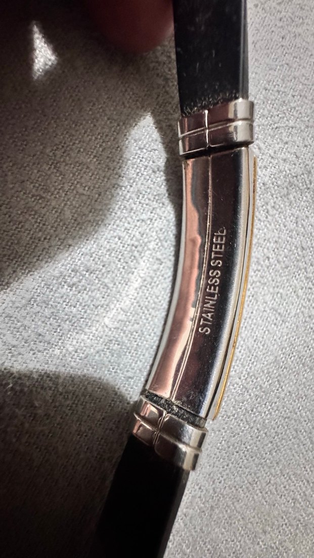 Siyah bantlı, parlak altın renkli paslanmaz çelik detaylı erkek biker bileklik, iş tarzıyla uyumlu güçlü bir tasarıma sahiptir. ️