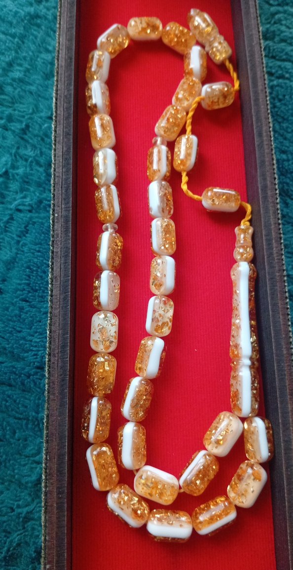 Renkli altın ve beyaz dikdörtgen boncuklardan oluşan erkek tesbih seti, bohem tarzda ve geleneksel görünüme sahiptir.