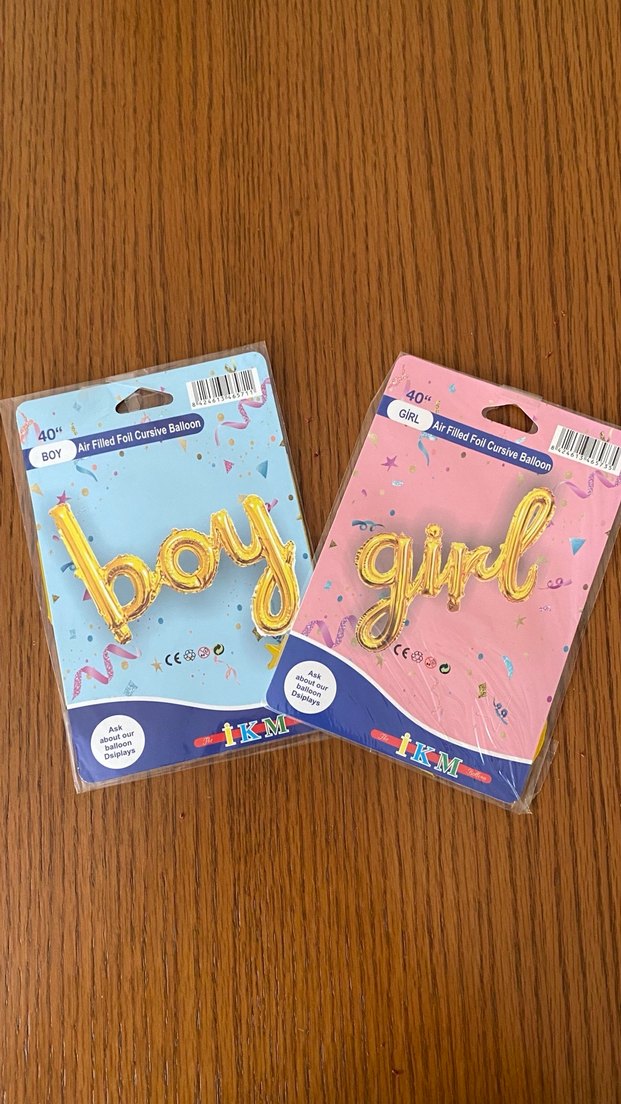 Altın renkli 'boy' ve 'girl' yazılı folyo balonlar, pastel renkli ambalajda sunulmaktadır. Kutlamalar için uygundur.