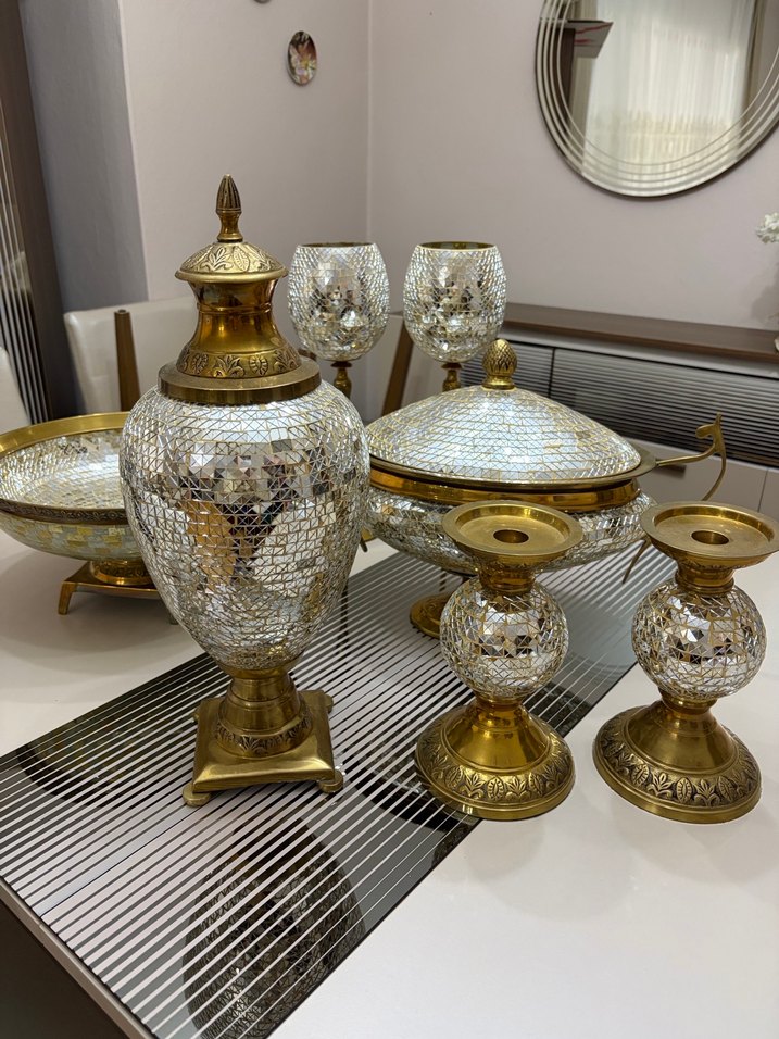 Altın renkli, etnik desenli ve klasik tarzda salon dekorasyon. İçinde dekoratif kavanozlar, şamdanlar ve kadehler bulunur. 1 adet meyvelik, 1 adet kapaklı meyvelik, 2 adet top mumluk, 2 adet uzun şamdan, 1 adet kupa içermektedir. Hassas bir üründür, İzmir içerisinde elden teslim edebilebilinir.