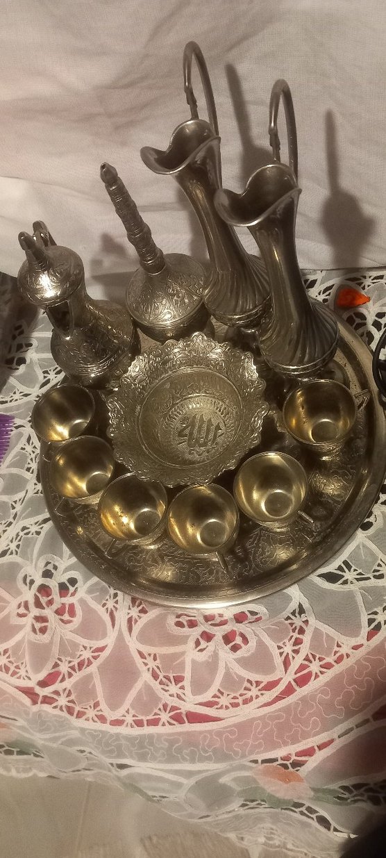 Bu koyu altın renkli sofra takımı, etnik desenlere sahiptir ve küçük fincanlar, süslü sürahiler ile tepsi içerir. Geleneksel detaylara sahiptir. ️