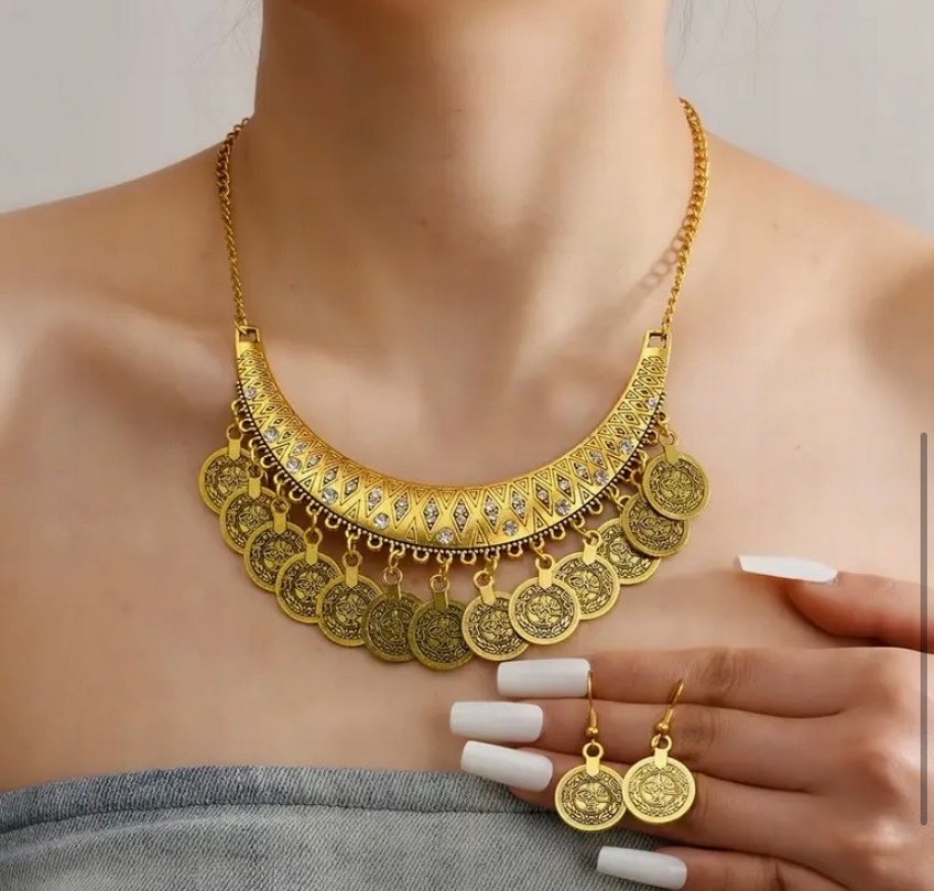 Altın Renkli Etnik Pullu Bohem Kolye Seti