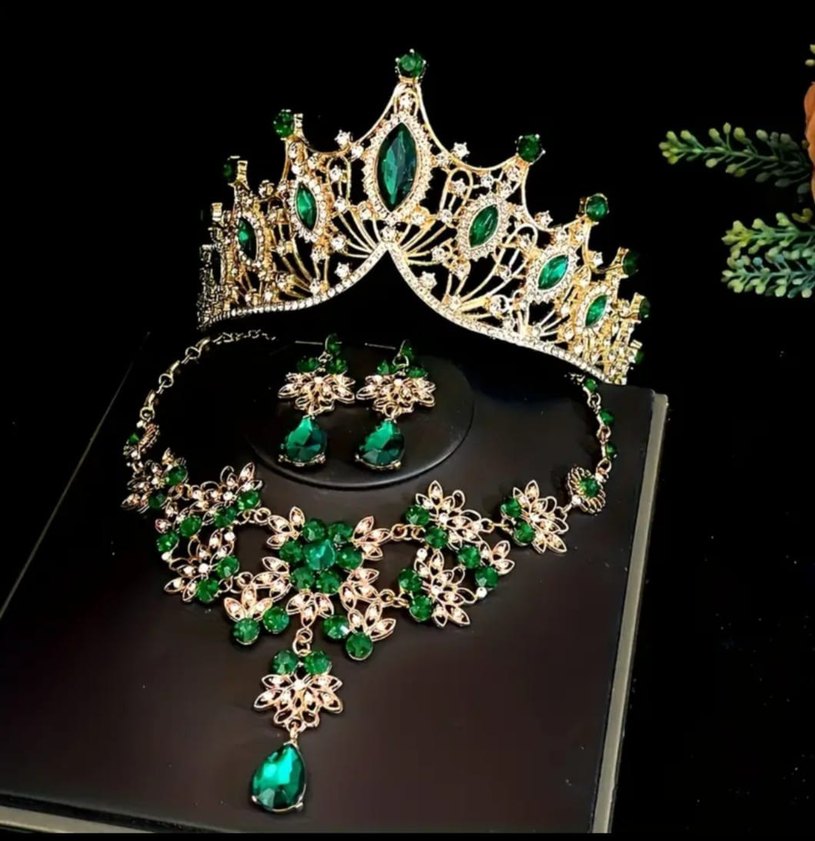 Yeşil taşlar ve etnik desenlerle süslenmiş altın renkli kolye, küpe ve taç içeren gösterişli takı seti.