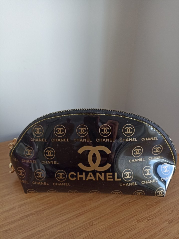 Parlak altın renkli, fermuarlı kadın makyaj çantası, plastik malzemeden ve Chanel esintili baskılı desene sahip. Günlük kullanım için uygun, Paris tarzında.