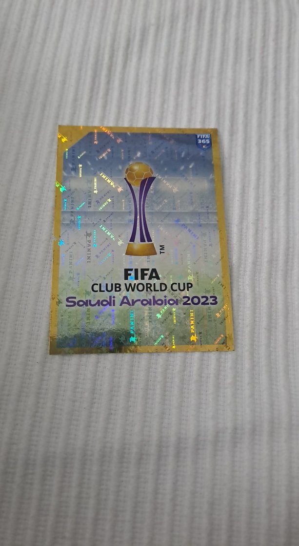 Parlak altın renkli FIFA Kulüpler Dünya Kupası 2023 logosu içeren rozet. Holografik desenli, sade ve atletik tarzda.