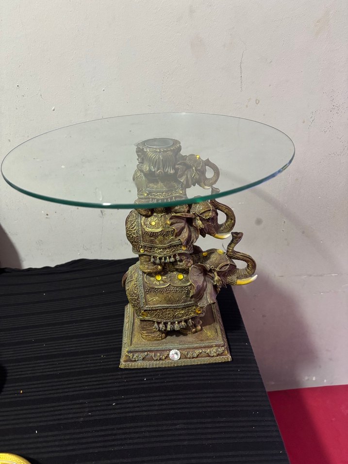 Yuvarlak cam üst yüzeye sahip, koyu altın renkli fil figürlü dekoratif sehpa. Detaylı fil tasarımı geleneksel bir hava katıyor.