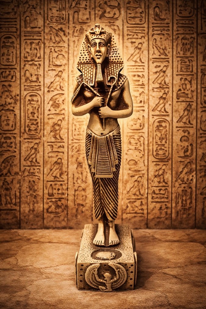 Koyu altın renginde, detaylı eski Mısır motifleriyle süslü bir kaide üzerinde duran firavun figürü.
