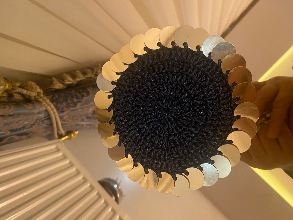Kadınlar için örgü şapka, altın rengi disklerle süslenmiş fırfırlı kenara sahiptir. Koyu, canlı ve avangart bir tarz sunar. 6 adet 31 pullu