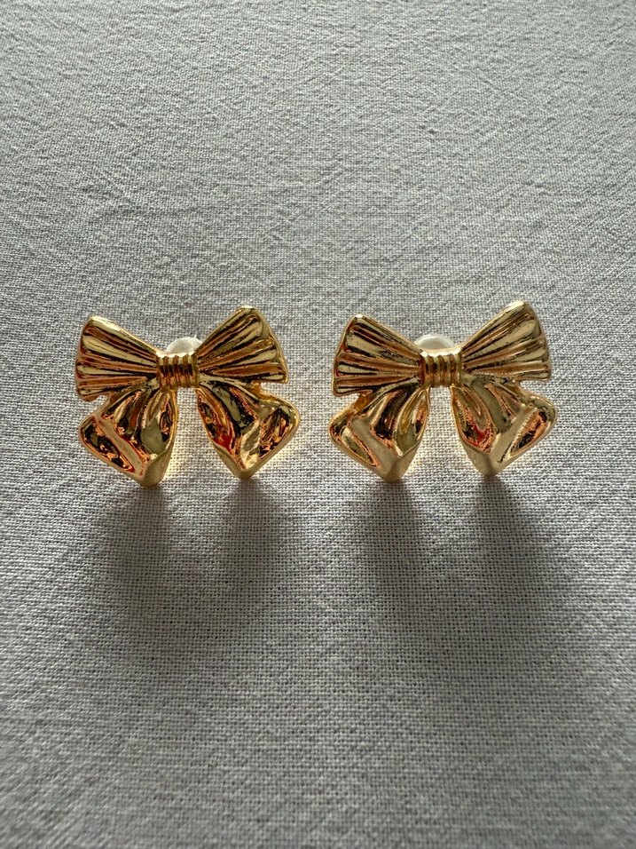 Altın renkli, parlak yüzeyli fiyonk şeklinde küpeler, düğün ve vintage tarzlar için uygun.