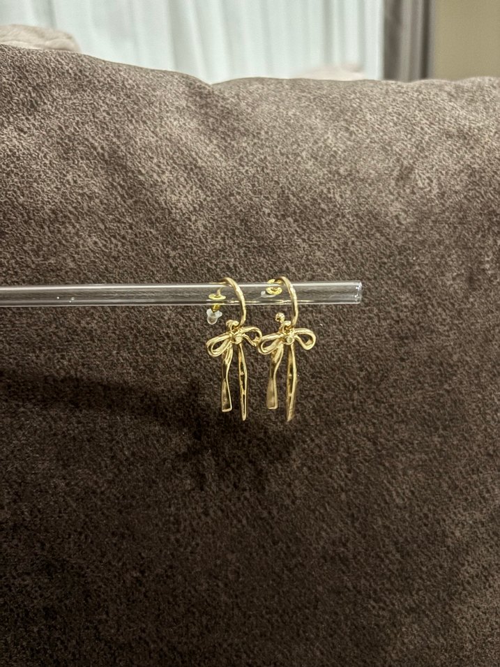 Parıltılı altın renkli, işlemeli fiyonk detaylı midi uzunlukta, çağdaş Paris tarzında düğün için uygun küpe.