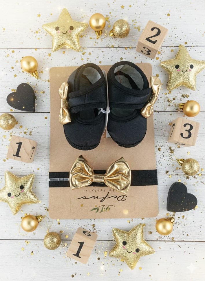 Altın Renkli Fiyonklu Mini Bebek Patik ve Saç Bandı Seti