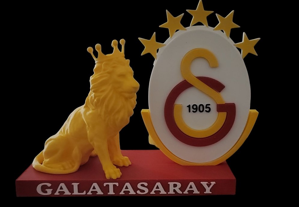 Parlak altın renkli figür, taçlı aslan ve "1905" yazılı Galatasaray armasıyla birlikte. Alt kısımda "GALATASARAY" yazısı yer alır.