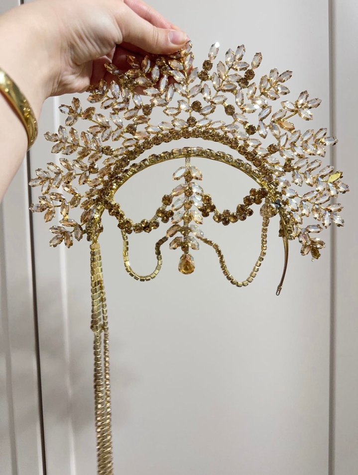 Altın renkli, parlak işlemelerle süslenmiş bohem tarzda, avant-garde tasarımlı gelin tacı. ✨1 kez kullandıl