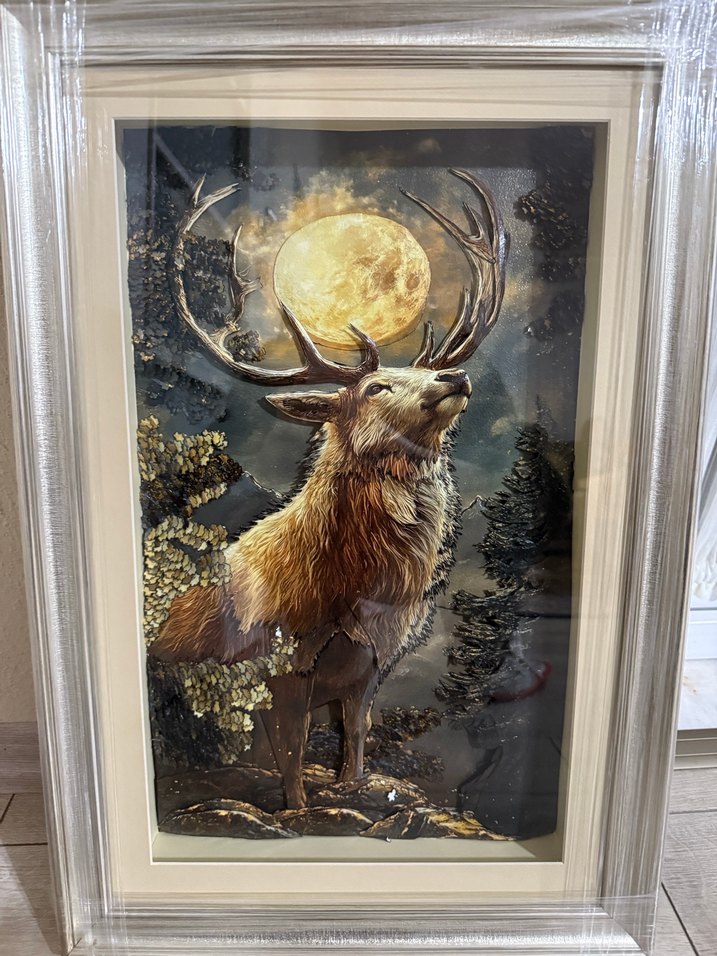 Koyu arka planda dolunay ışığında, büyük boynuzlu altın renkli geyik figürünün yer aldığı çerçeveli tablo.