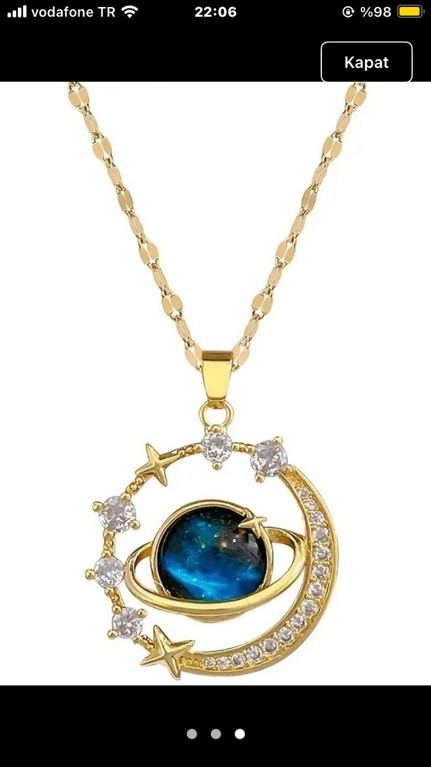Altın renkli zincir ve küçük kristallerle süslenmiş gezegen ve hilal figürlü kolye, romantik akşamlar için uygun.