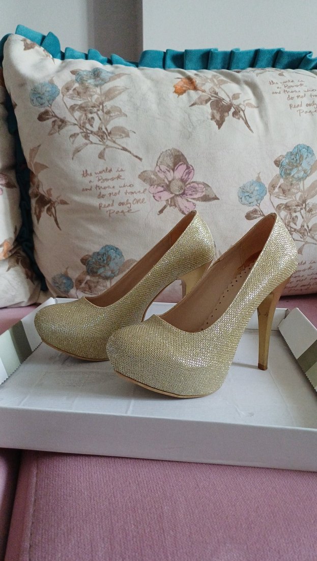 Altın renginde, ışıltılı topuklu kadın ayakkabısıdır. Kauçuk malzemeden yapılmış, modern klasik ve göz alıcı bir şıklık sunar, düğünlerde tercih edilir.