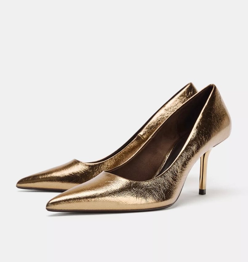 Parlak gold altın deri stilettolar, sivri burun ve ince topuklu, ofis ve özel günler için zarif ve şık.