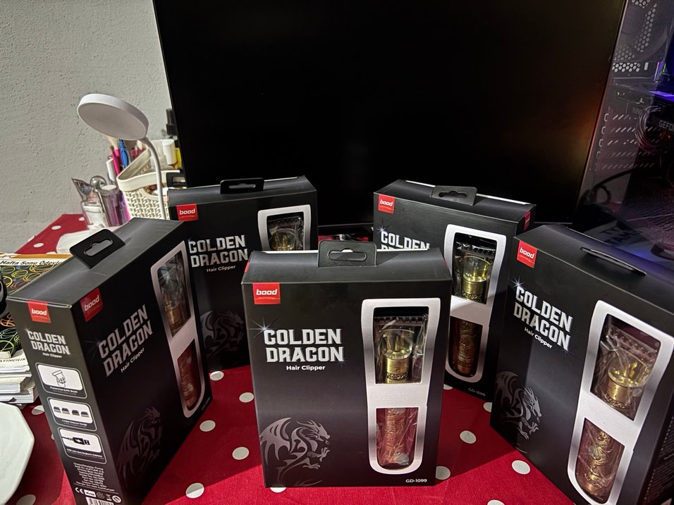 Altın renkli Golden Dragon saç kesme makinesi, şık kutusunda ejderha tasarımıyla gelir. Metalik yüzeyli, hassas kesim sağlar. ✂️