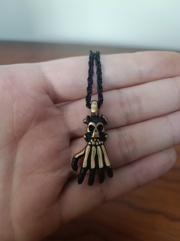 Siyah burmalı zincirli, iskelet el figürlü koyu altın renkli gotik erkek kolye.