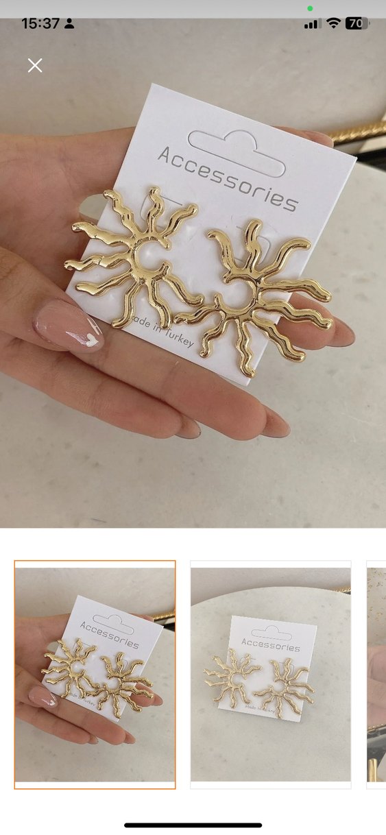 Parlak altın renkli, güneş desenli mini küpeler, günlük kullanım için bohem ve minimalist tarzda. Kutusunda yollanacaktır