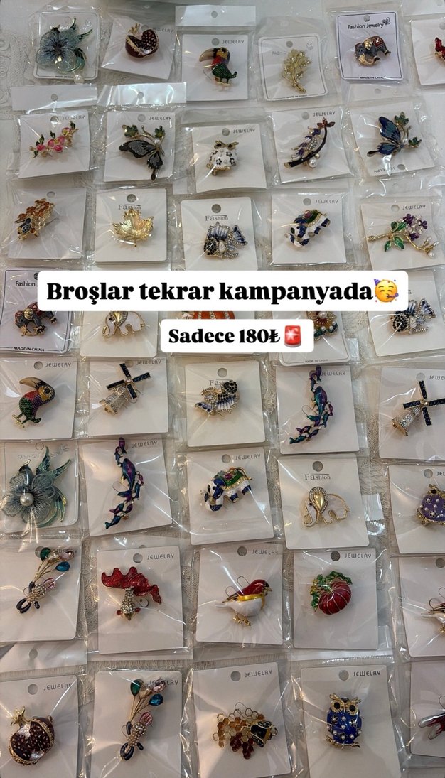 Çeşitli tasarımlarda, altın renkli hafif broşlar, tek tek paketlenmiş. Kampanya fiyatı 180₺. ✨