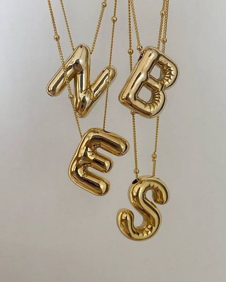 Parlak nakışlı harf kolye uçlarına sahip altın renkli kolye görsel temsilidir.