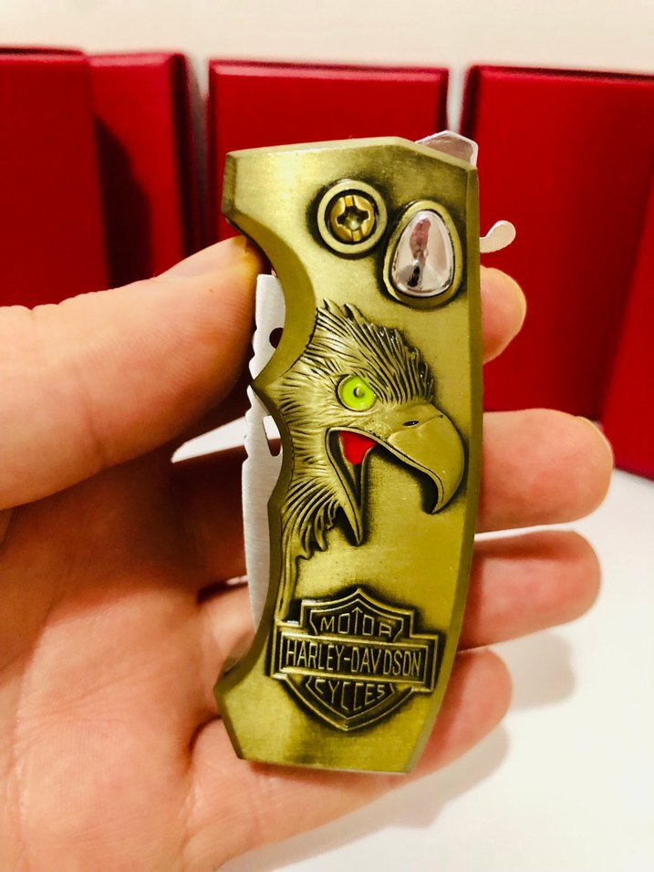 Altın renkli Harley-Davidson Çakmak, renkli kartal tasarımı ve logo detayına sahip. Canlı renklerle küçük ve şık. Çakı Çakmak