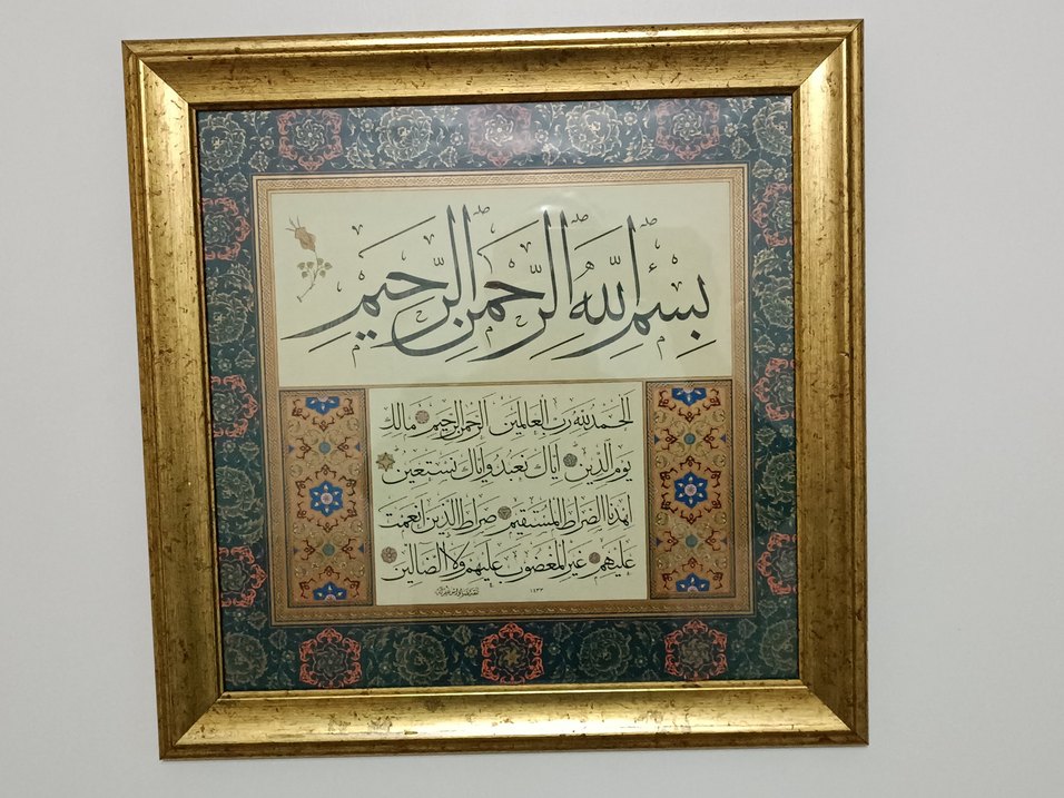 Altın renkli çerçevede, koyu tonlarda İslami hat sanatının kullanıldığı, detaylı çiçek desenleriyle süslenmiş tablo.