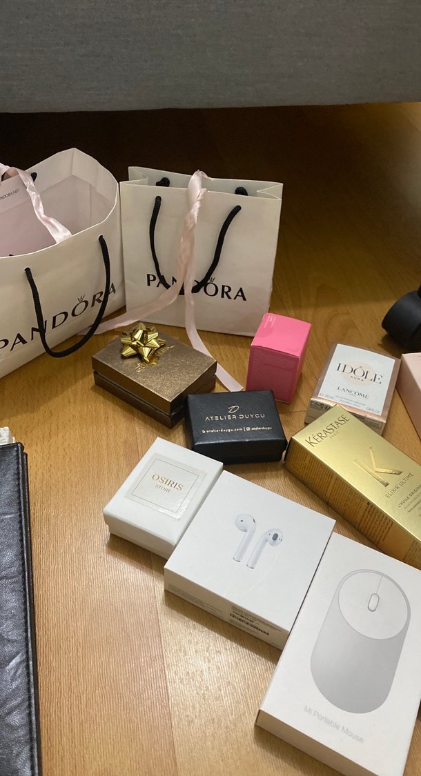 Altın renkli hediye kutusu ve Osiris, Idole gibi kozmetik ürünlerinin bulunduğu set. Çeşitli boyda hediye paketleri