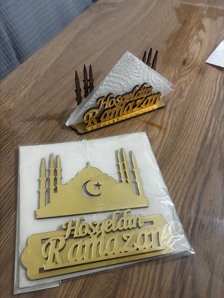 Pleksi ayna Parlak altın renkli "Hoşgeldin Ramazan" yazılı ve cami silüetli peçetelik, Ramazan dekorasyonu için uygun.