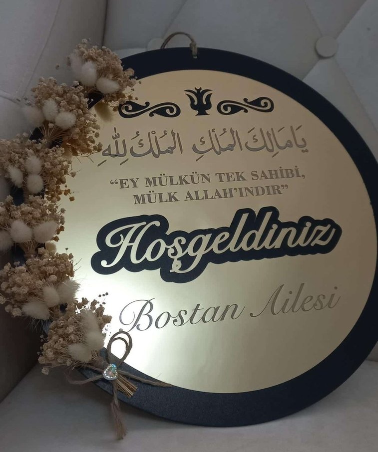 Parlak altın renkli, 'Bostan Ailesi' yazılı hoşgeldiniz mesajlı duvar dekoru.