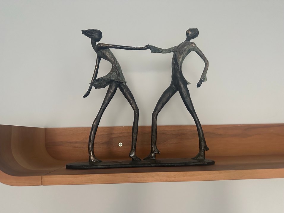 Altın tonlarında, koyu renkli iki figürün el ele tutuştuğu detaylı dokulu dekoratif heykel. Metaldir. Her mekana sanatsal bir hava katar.