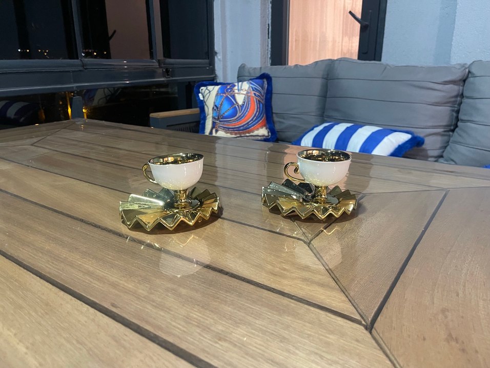 İki adet açık altın renkli kahve fincanı ve zigzag desenli tabaklardan oluşan set. ☕