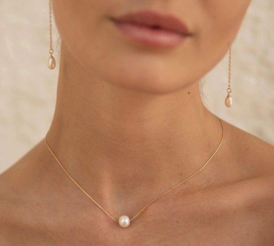 Altın renkli ince zincir ve tek inci detayına sahip, romantik akşamlar için minimalist ve zarif midi uzunlukta kolye. Desensiz ve pürüzsüz yüzeye sahiptir.
