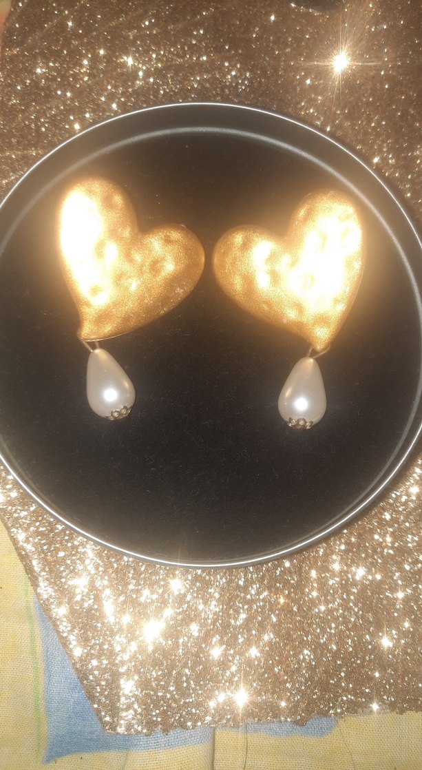 Parlak altın renkli, işlemeli kalp şeklinde tasarlanmış ve inci detaylı midi küpeler, cesur ve göz alıcı tarzlar için uygun.kusursuz hiç kullanılmadı