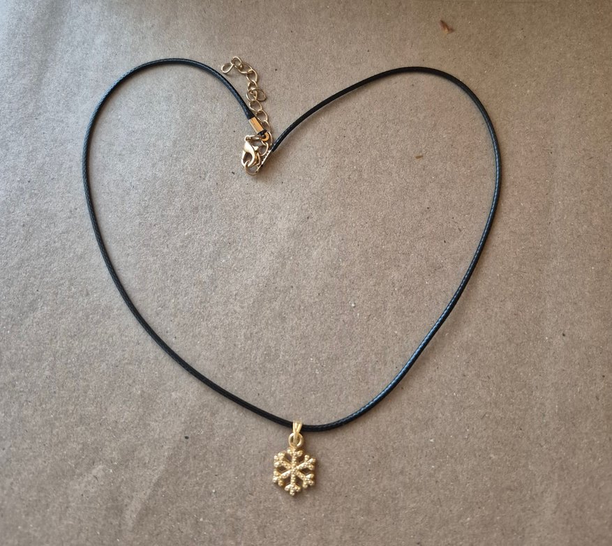 Romantik geceler için altın renkli, ip detaylı ve işlemeli kar tanesi kolye. Midi uzunlukta, minimalist ve bohem tarzda. ❄️