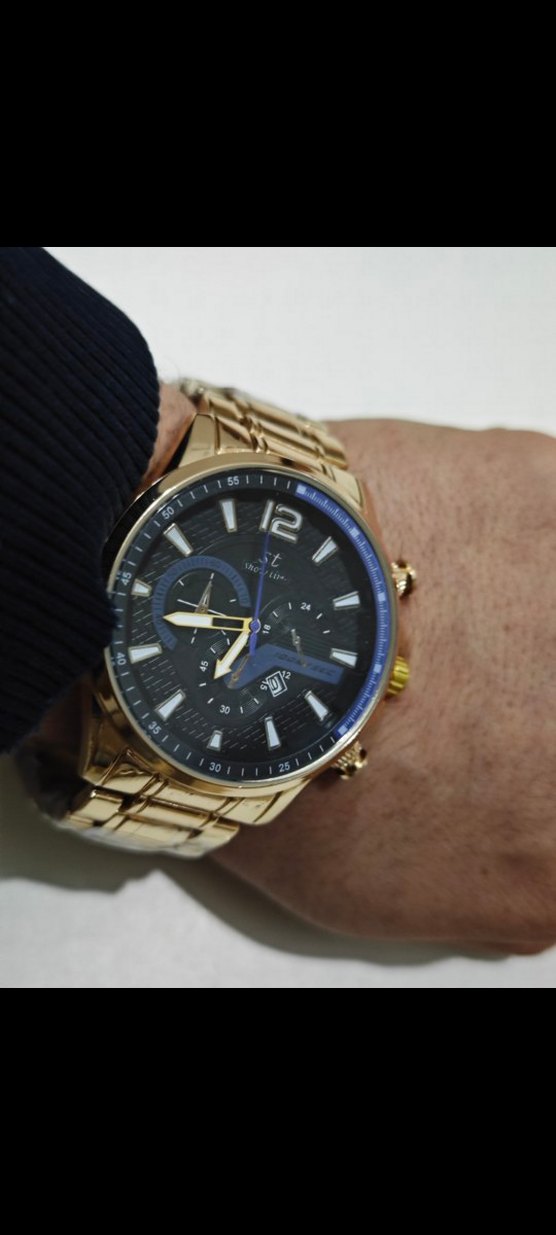 Parlak altın metal kayış ve siyah kadranlı, 12 rakamı bulunan erkek kol saati. İş ve sokak stili birleşimi, kronograf ve tarih göstergesi içerir. ⌚