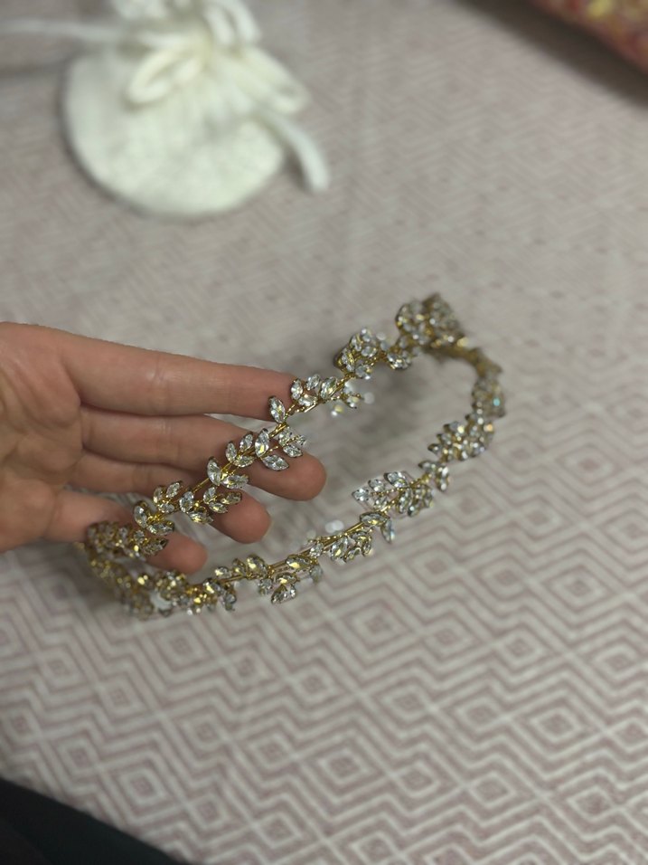 Altın renkli, payetli çiçek desenli gelin tacı, klasik ve bohem zarafet için uygun. ✨