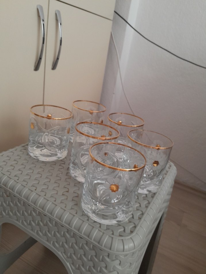 Altın renkli ince işlemeli çizgiler ve noktalarla süslenmiş, üzerinde çiçek desenleri bulunan 6 adet şeffaf cam bardak seti.