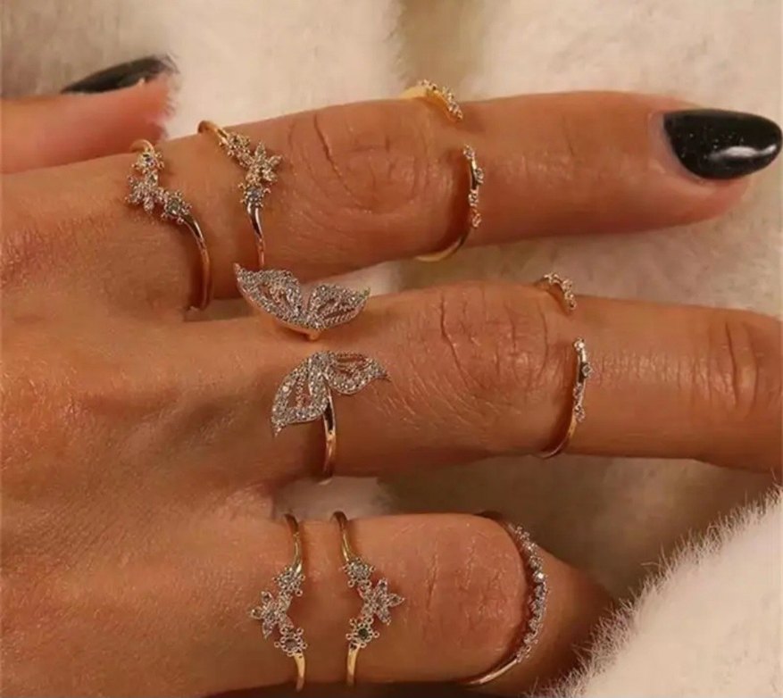 Altın renkli, işlemeli ve payet detaylı bohem tarzda, düğün için uygun kadın 8 li yüzük seti. 500 tl✨ kargo aliciya aittir.
