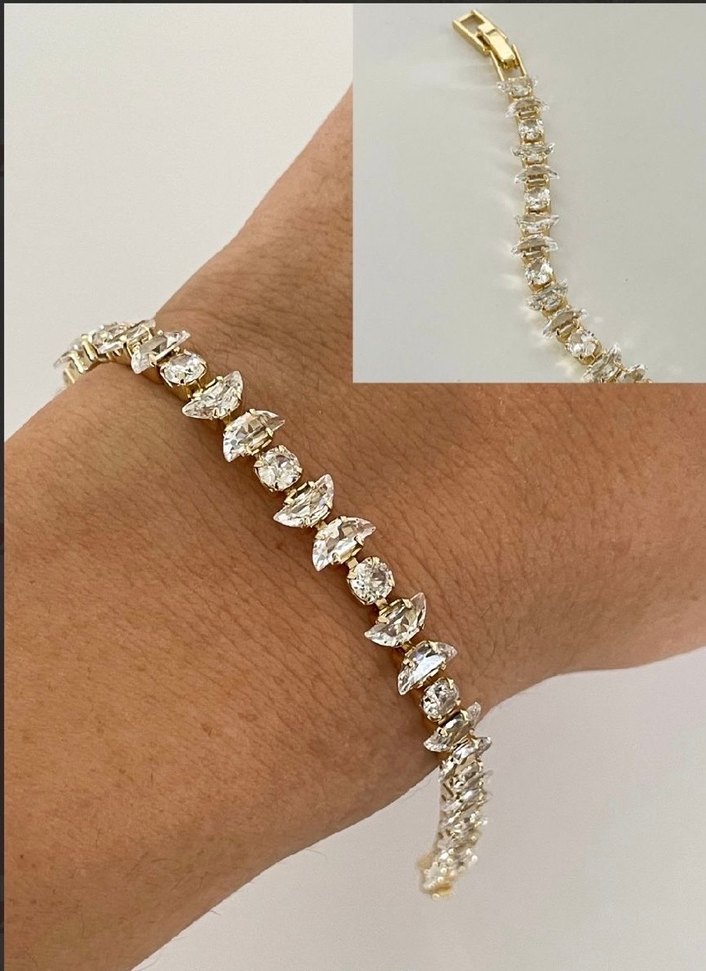 Altın renkli, işlemeli ve payetli bileklik, hafif ve göz alıcı bir görünüm sunar. Düğünler için klasik ve geleneksel tarzda tasarlanmıştır.