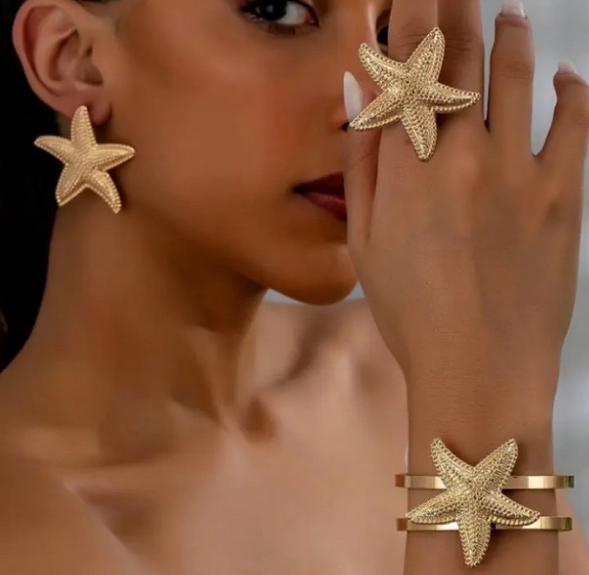 Parlak altın renkli, işlemeli deniz yıldızı tasarımlı ve payet detaylı kulak manşeti, cesur ve göz alıcı bir görünüm sunar.