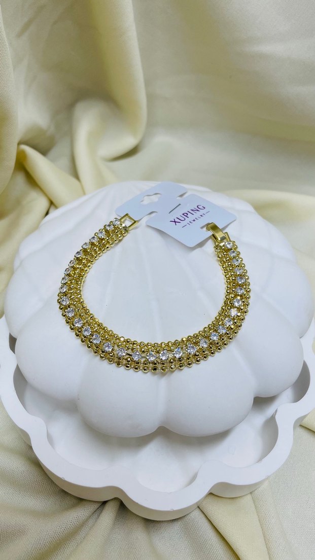 Düğünler ve klasik zarafet için uygun, altın renkli, işlemeli ve payetli detaylara sahip kadın bileklik. ✨