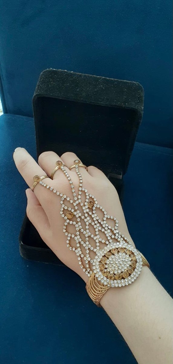 İşlemeli ve payet detaylı altın renkli kadın el zinciri, parlak bohem tarzıyla düğünler için uygun umreden geldi bi iki defa kullanıldı yüzük kısımları ayarlanabilir ✨
