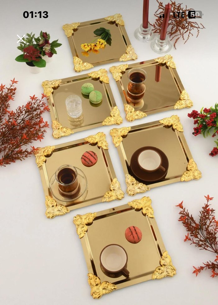 İşlemeli köşeleriyle klasik dokunuş sunan altın renkli kare tabaklar. Hafif ve yansıtıcı yüzey sunar. ️