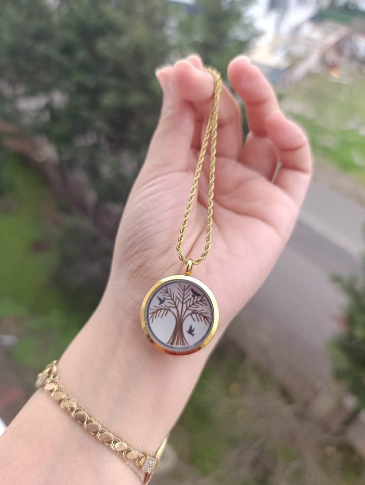 Altın renkli, zincir detaylı midi uzunlukta kolye, işlemeli ağaç desenli ucu ile minimalist bohem tarzına uygun.