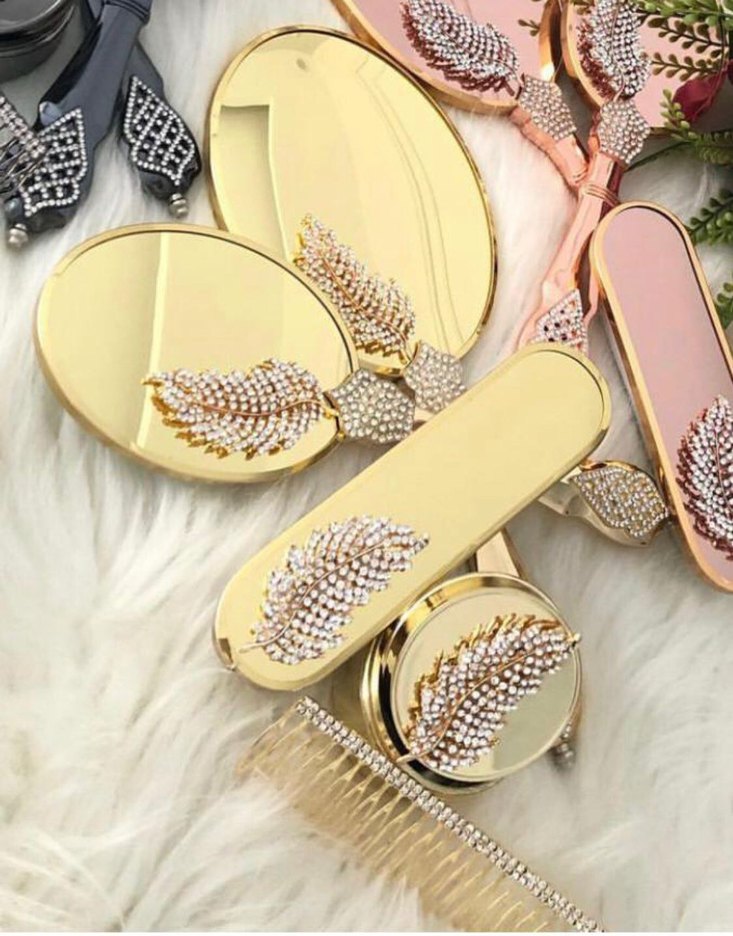Işıltılı işlemeli ve payetli, bohem tarzda altın renkli aksesuar seti; ayna ve tarak içerir. ✨